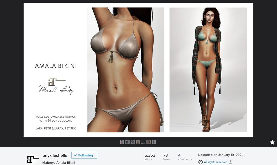 Belleza used to be one of the major mesh body brands in Second Life, especially during the years when Venus, Isis, and Freya dominated the grid. Today, it still has a loyal user base and a familiar set of shapes, but it’s no longer one of the default choices for new shoppers. Most modern fashion releases prioritise Maitreya, Legacy, Reborn and sometimes Kupra. Belleza bodies appear less frequently in 2025 events, but they are still present in older lines, sales, gifts, and some niche creators who continue to support them.